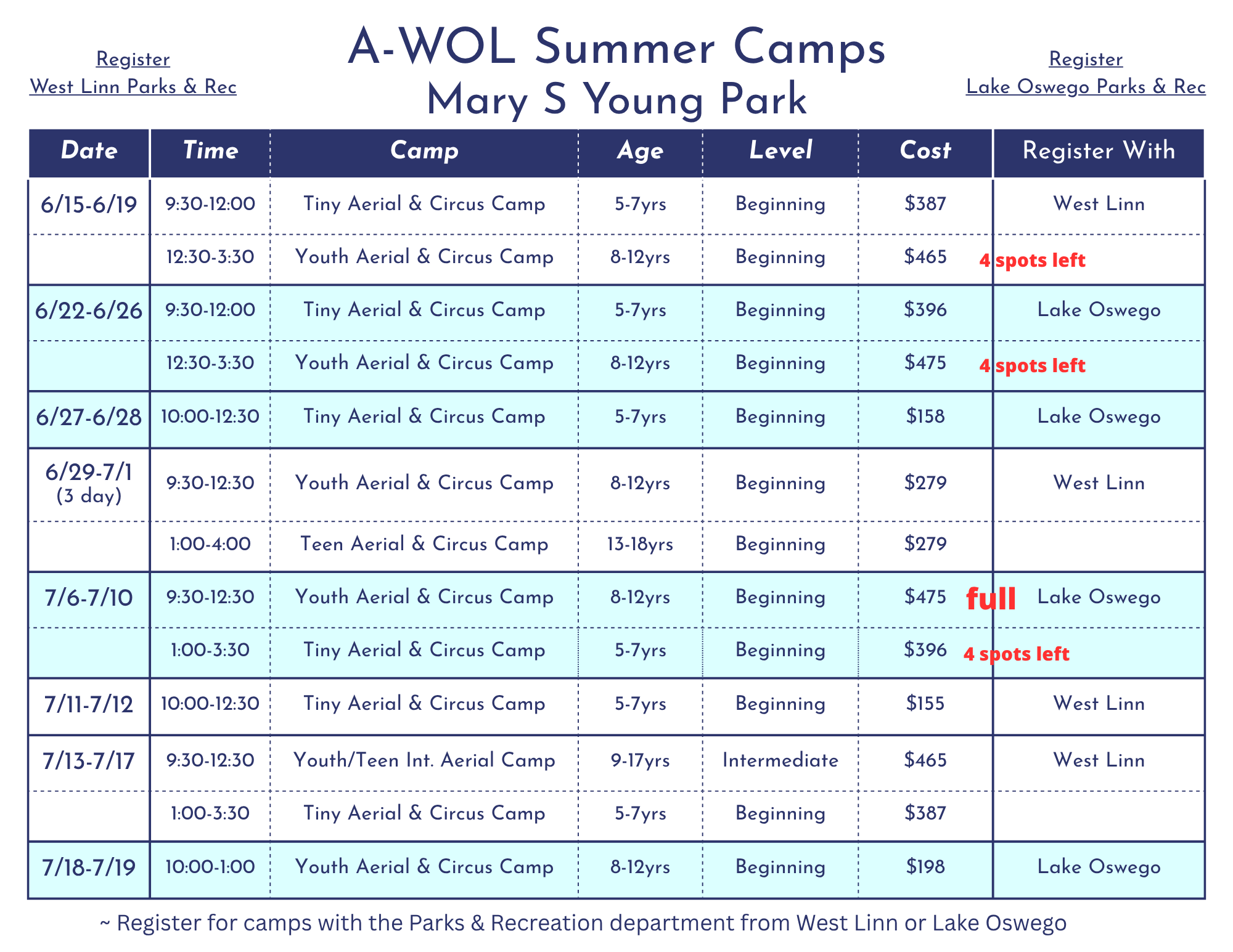 Mary S Young Park camps run every week beginning 6/15 for students ages 4-7yrs (tiny), 8-12yrs (youth), or 13-18yrs (teen). Register for camp through either West Linn Parks & Recreation or Lake Oswego Parks & Recreation.